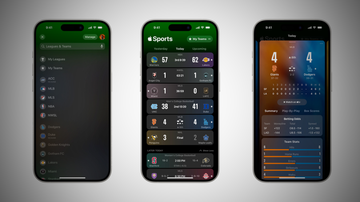 • Speed: Apple Sports is designed to be fast and responsive, delivering real-time updates and notifications. Users can quickly navigate between scores and upcoming games, and tap to go to the Apple TV app to watch live games. Apple Sports also syncs with favorites selected within the My Sports experience in the Apple TV app and Apple News, creating a seamless and consistent experience across devices.