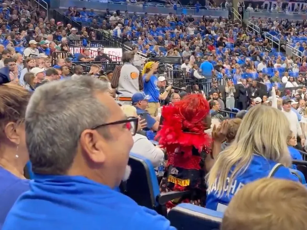 Dressed head-to-toe as a hawk, complete with bright red feathers, a sequined vest, and a matching headband, this dedicated Hawks supporter made their presence known by unleashing loud, bird-like screeches every time Magic players stepped to the free-throw line.