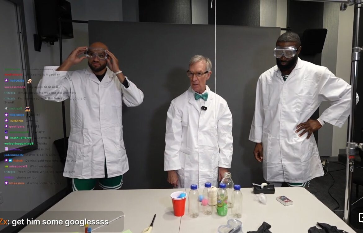 Derrick White attempting a science experiment with Jaylen Brown and Bill Nye the Science Guy😂