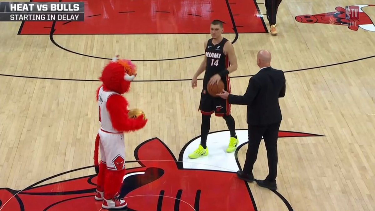 During the delay, Benny challenged Heat guard Tyler Herro to a backward half-court shot contest. Benny stepped up first and drilled it immediately. Herro, faced with the worst possible competitive math (you can’t “win” against a mascot who just went 1-for-1 from half court while facing the wrong direction), declined to follow through, effectively backing out after Benny’s first-shot swish.
