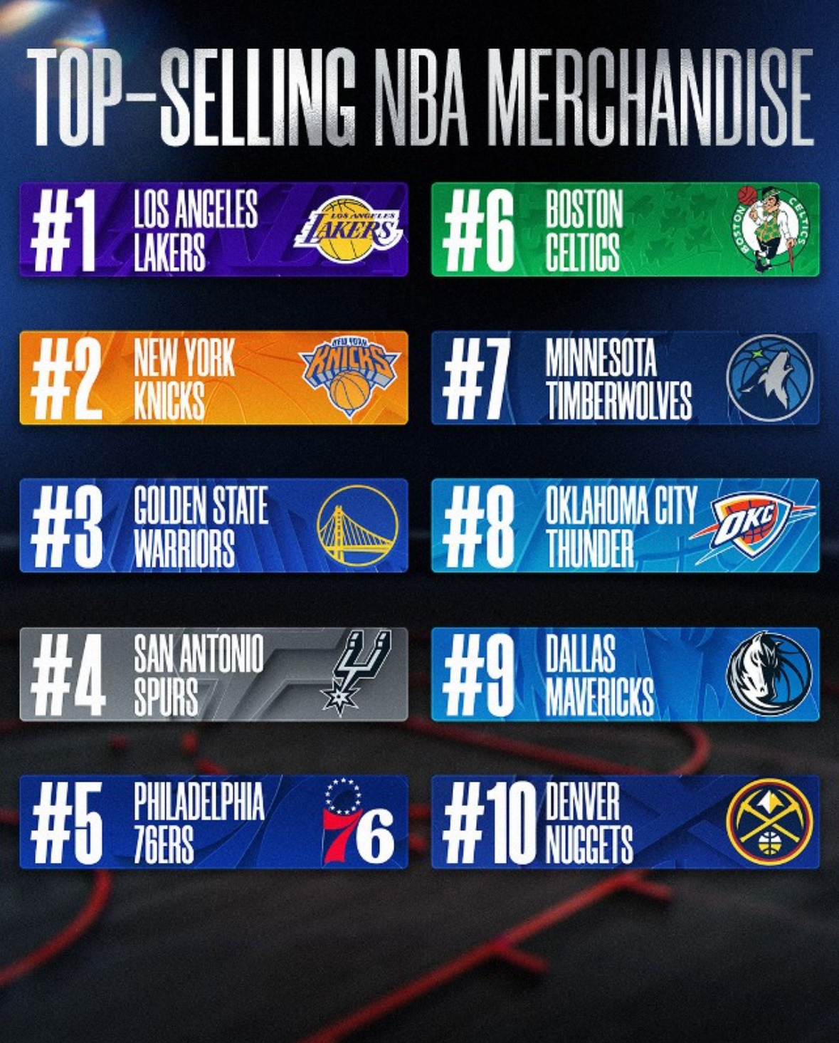 The team-merchandise rankings tell a parallel story: the Lakers at No. 1 and Knicks at No. 2 reflect two massive markets with global reach, while franchises like Golden State, San Antonio, and Oklahoma City continue to prove that star power can scale a brand far beyond local geography.