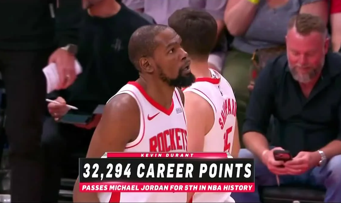 Kevin Durant moved past Michael Jordan on Saturday night to claim fifth place on the NBA’s all-time regular-season scoring list, reaching 32,294 career points in the Houston Rockets’ 123-122 win over the Miami Heat. The milestone came on a fourth-quarter three-pointer, pushing Durant ahead of Jordan’s 32,292-point total.